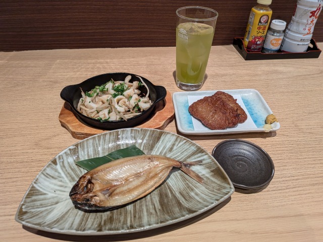 とにもかくにも飲みます。「静岡緑茶サワー」のお供に、「マンボウ鉄板炒め」「ちんちん揚げ」「鮮魚の漁師干し」を注文しました。