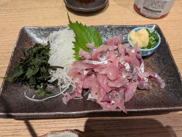 もう一品、「あじのタタキ刺」を追加注文しました。これ、もう、見るだけでわかります。うまいと。ピンクの身と、銀色に輝く皮目に惚れ惚れとします。
