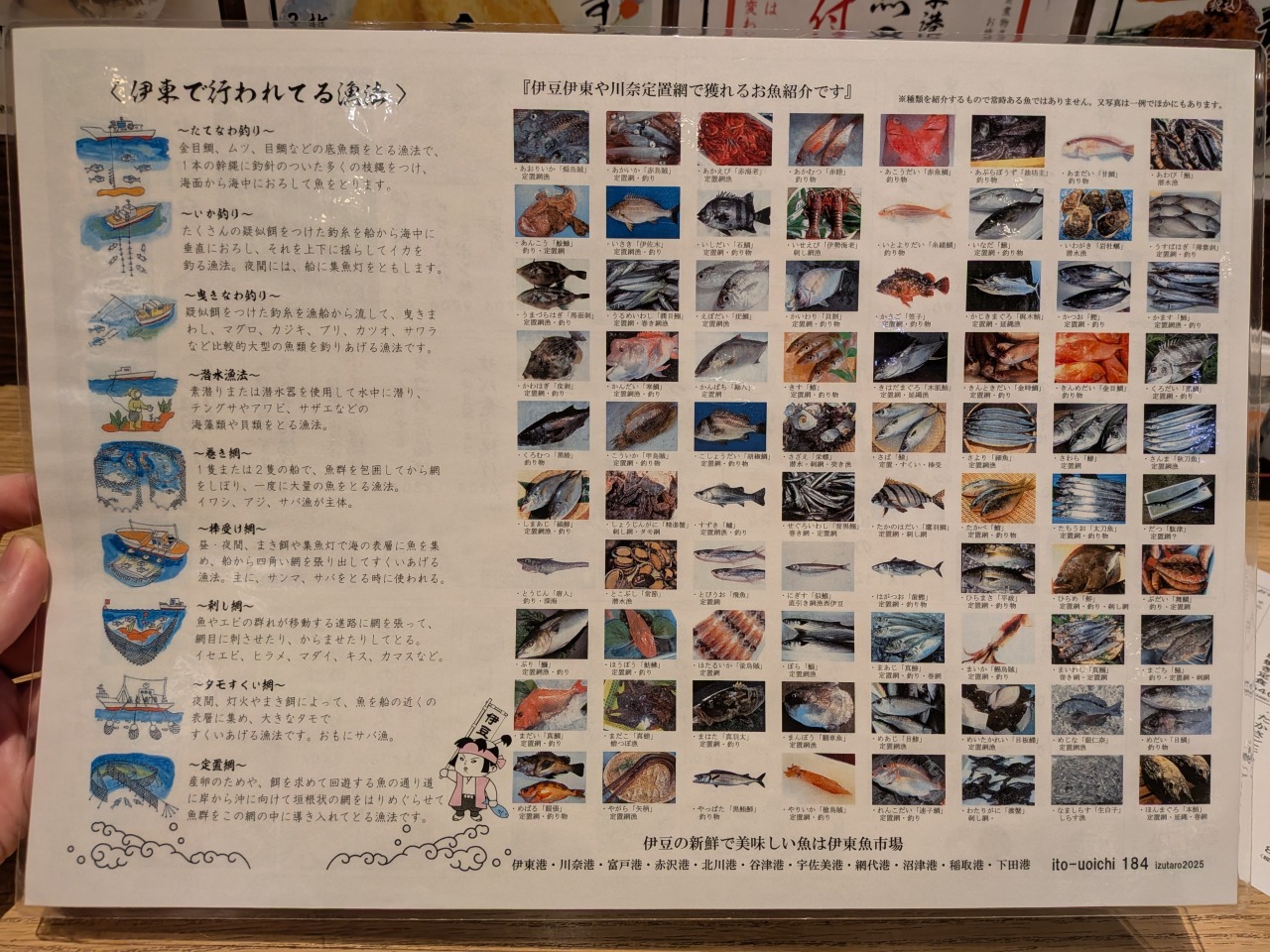 入店すると、カウンター席に通されました。席にはメニュー表のほか、伊東で行われる漁法と、伊東で獲れる魚を紹介するシートもありました。伊豆太郎では、伊東市の伊東魚市場で仕入れた魚介を使っています。アブラボウズ、アコウダイ、ブリ、アワビなど、高級魚界のアベンジャーズみたいな名前の並ぶ中に、マンボウが混ざっているのも気になります。