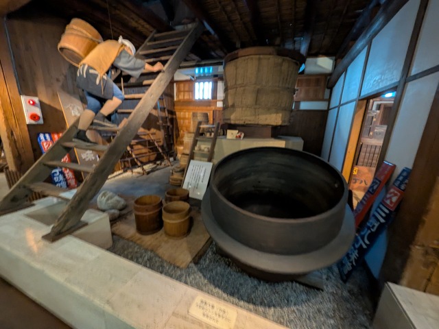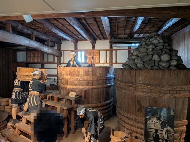こちらは、麹菌の十分に繁殖した豆こうじを桶に仕込んでいく作業を再現したものです。豆こうじに水と塩を混ぜたものを、「半切り」という小さな桶(それでも大人2人で担ぐサイズ)に入れて運び、大きな木桶の中に入れます。桶の中に人がいますが、彼は味噌を足で踏んで中の空気を抜いています。