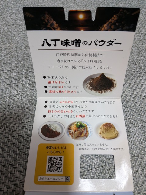 その名の通り、八丁味噌をフリーズドライにしてパウダー状にしたものです。粉末にすることで調味料として取り回しやすくなっており、お好みの料理に八丁味噌のコクをプラスできます。目玉焼きや冷奴などにかけても美味しいと思います。