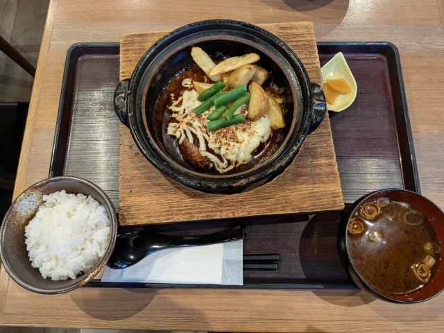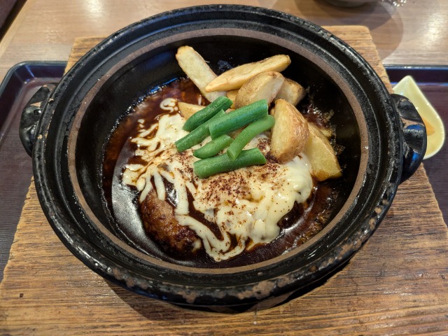 その名の通り、隠し味に八丁味噌を使ったデミグラスチーズハンバーグです。土鍋でグツグツと煮えながらやってきます。