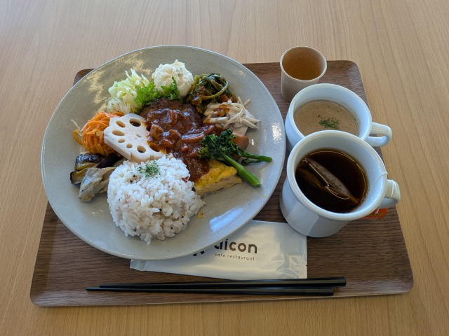 ちょうどお昼になったので、ふれあいの里HASUパーク内で昼食をとることにしました。はす見テラスのカフェレストラン「aicon」にお邪魔しました。