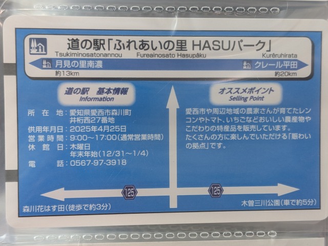 道の駅ふれあいの里HASUパークは、愛知県愛西市の愛知・岐阜・三重県道125号線(佐屋多度線)沿いにある道の駅です。元は「道の駅立田ふれあいの里」として営業していましたが、順次リニューアルが進み、2025年4月に農産物直売所のリニューアルをもって駅名が「ふれあいの里HASUパーク」に改称されました。そして、2026年4月に残りの全ての施設が開業してグランドオープンとなりました。